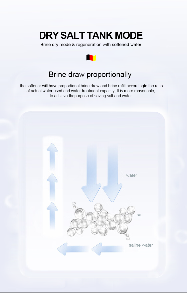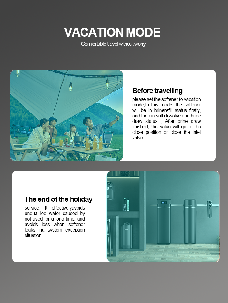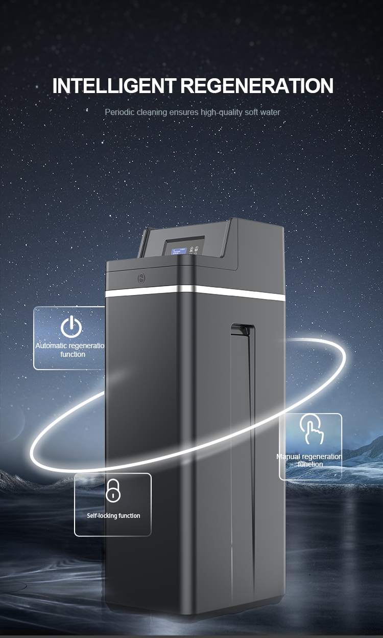 Efficiently reducing calcium and magnesium ion contentof tap water. After the resin is invalid, the regenerationfunction will automatically control the device to regenerateresin by brine,recovering the softening function of the resin.