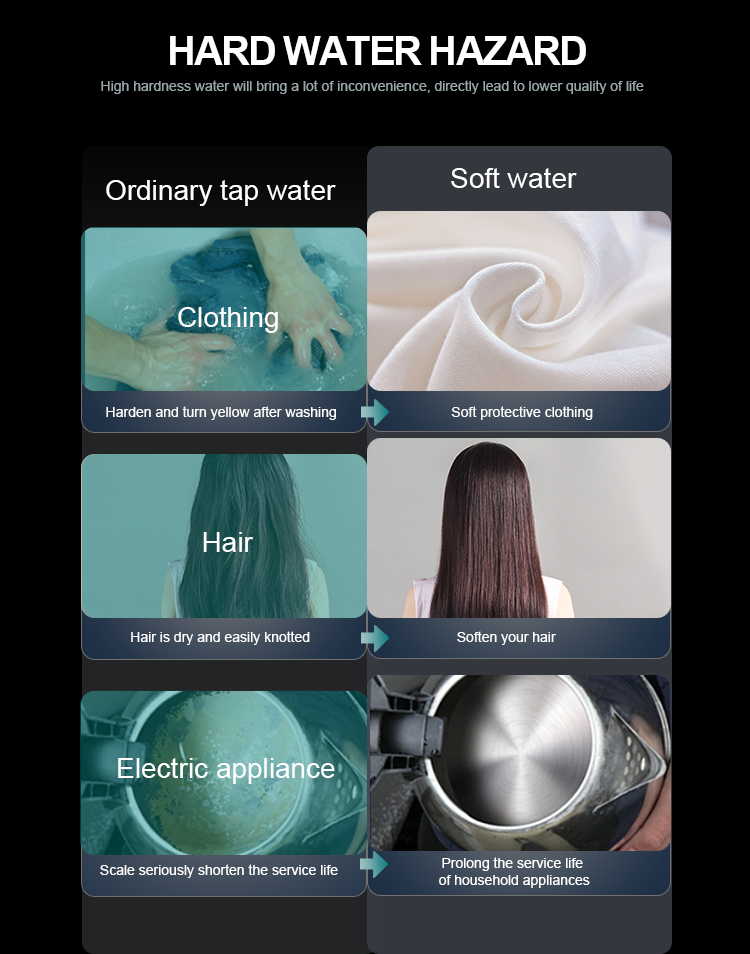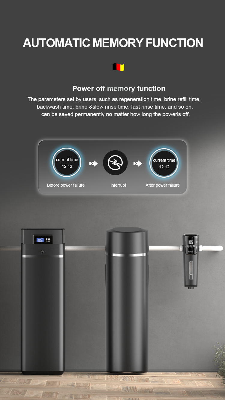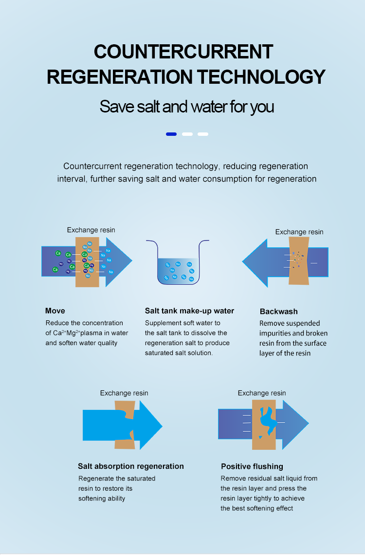 Efficiently reducing calcium and magnesium ion contentof tap water. After the resin is invalid, the regenerationfunction will automatically control the device to regenerateresin by brine,recovering the softening function of the resin.